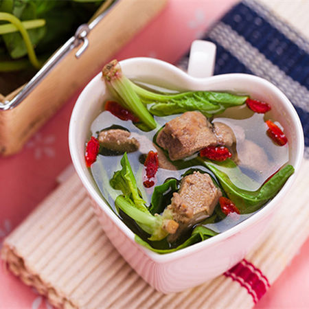 3. 猪肝入沸水煮开,浮去沫渣,再加入菠菜、枸杞,调入鸡精及香油即可。